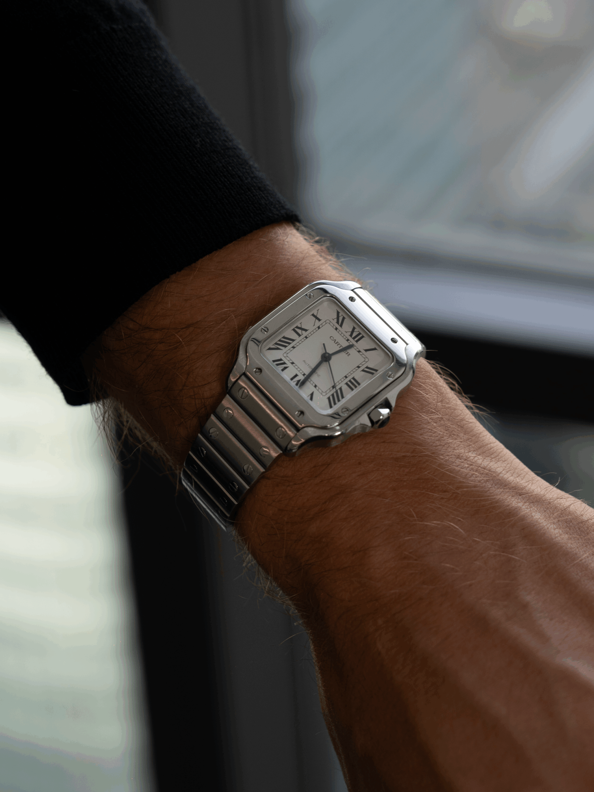 With its bold square case, exposed screws, and elegant steel bracelet, the Santos is instantly recognisable. It was originally created in 1904 for aviator Alberto Santos-Dumont, making it one of the very first men’s wristwatches ever made.