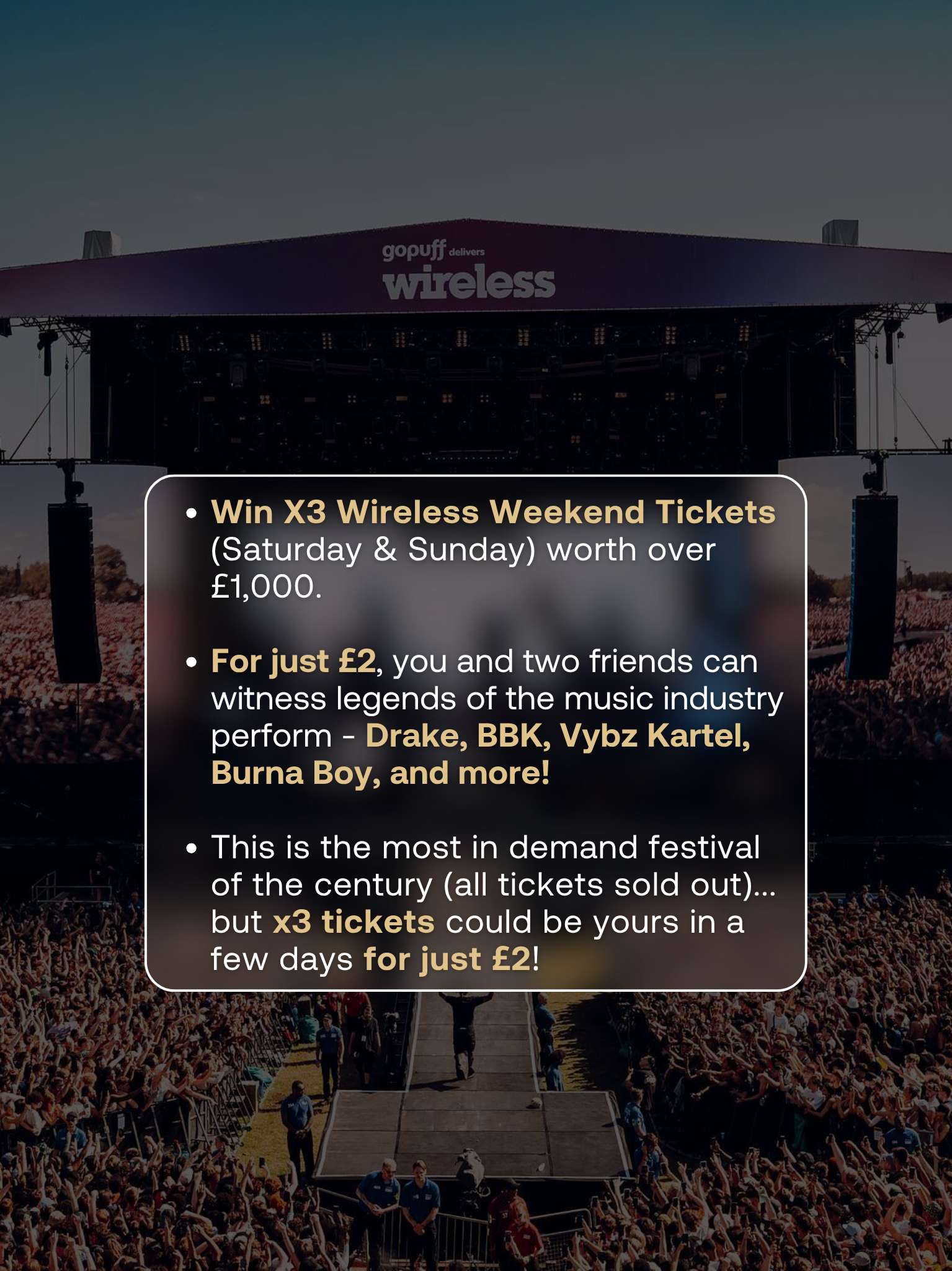 You can win x3 tickets worth over £1,000 for you & friends, for the sold-out Saturday & Sunday Wireless Festival, for just £2!